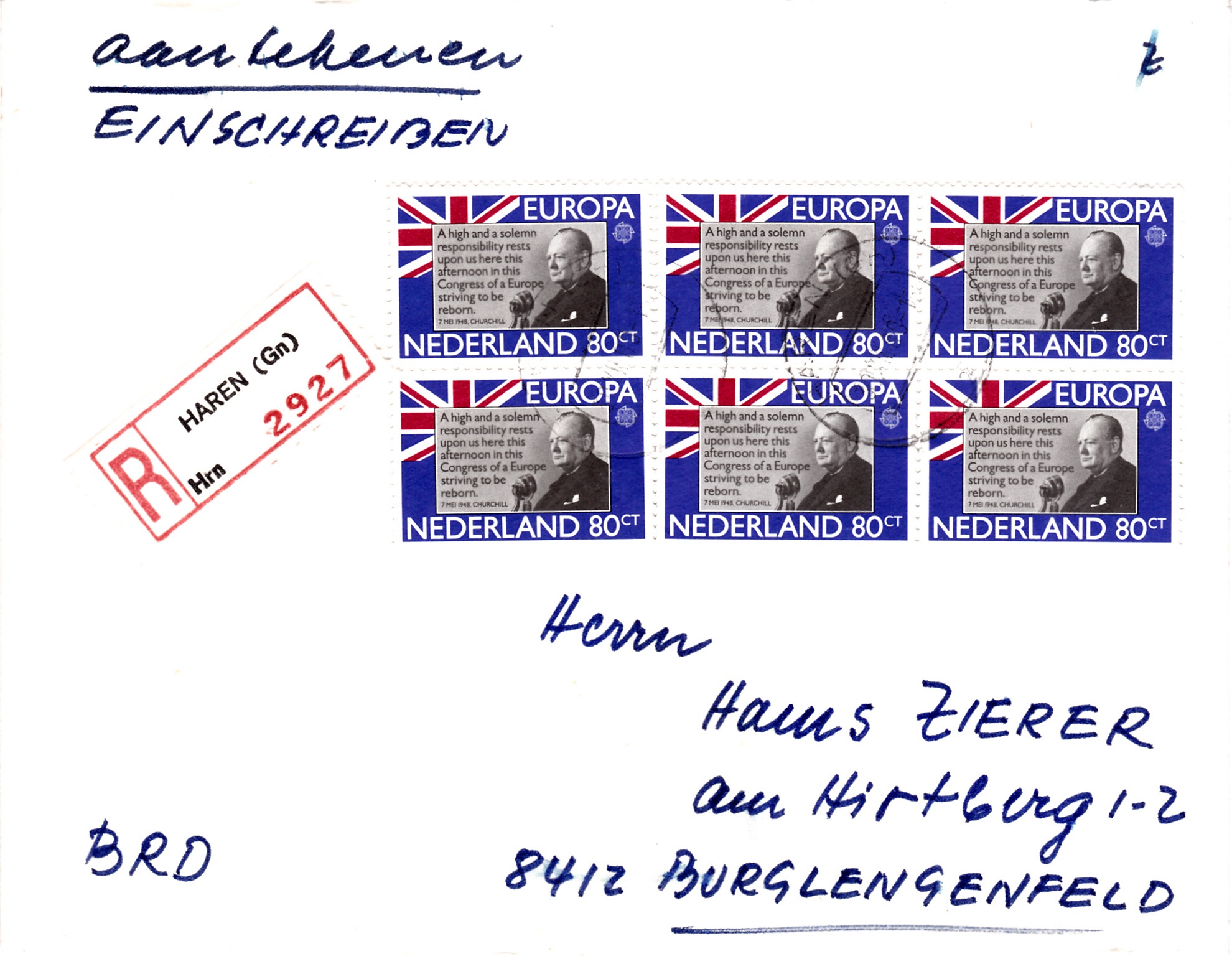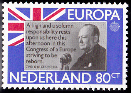 In den Niederlande erschienen die Europamarken 1980 zum Gemeinschaftsthema "Bedeutende Persönlichkeiten" am 23. September 1980. Hier die Marke zu 80 Cent mit einer Abbildung von Winston Churchill (1874-1965). Die Auflage betrug 6 659 900 Stück.