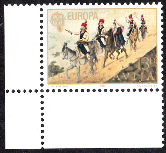 In Jugoslawien erschienen die Europamarken 1981 zum Gemeinschaftsthema "Folklore" am 5. Mai 1981. Hier die Marke zu 13 Dinar mit der Abbildung " Hochzeiter" (nach einem Gemälde von Nikola Arsenovic (1823-18.7. 1887)). Die Auflage betrug 990 000 Stück.