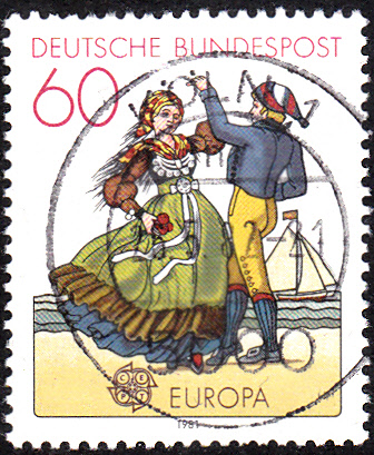 Bei der Deutschen Bundespost erschienen die Europamarken 1981 am 7.5.1981 zum Gemeinschaftsthema "Folklore". Hier die Marke zu 60 Pfennig mit der Abbildung eines Tanzpaares in friesischer Tracht. Die Auflage betrug 116 541 000 Stück.