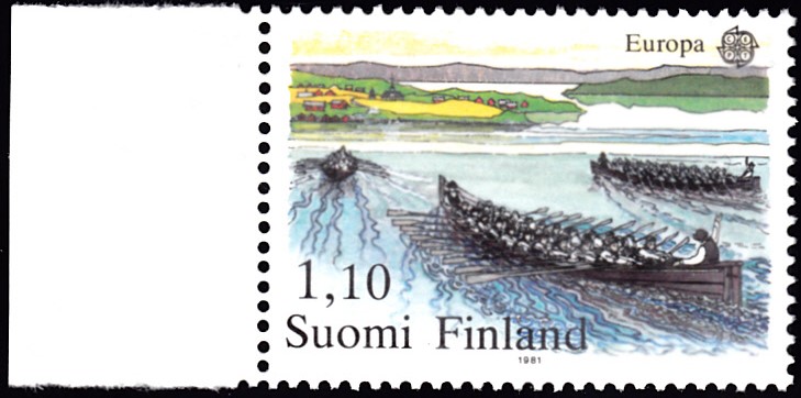 In Finnland erschienen die Europamarken 1981 zum Gemeinschaftsthema "Folklore" am 18. Mai 1981. Hier ein Exemplar der Marke zu 1,10 Mark mit einer Abbildung zum "Kirchenrudern". Die Auflage betrug 8 000 000 Stück.