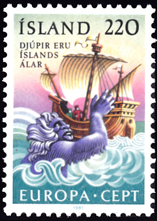 Die Europamarken 1981 zum Gemeinschaftsthema "Folklore" erschienen in Island am 4. Mai 1981 mit Illustrationen zu isländischen Volksmärchen. Hier die Marke zu 220 Aurar mit einer Illustration zu "Tief ist das Meer um Island herum". Die Auflage der Marke betrug 1 000 000 Stück.