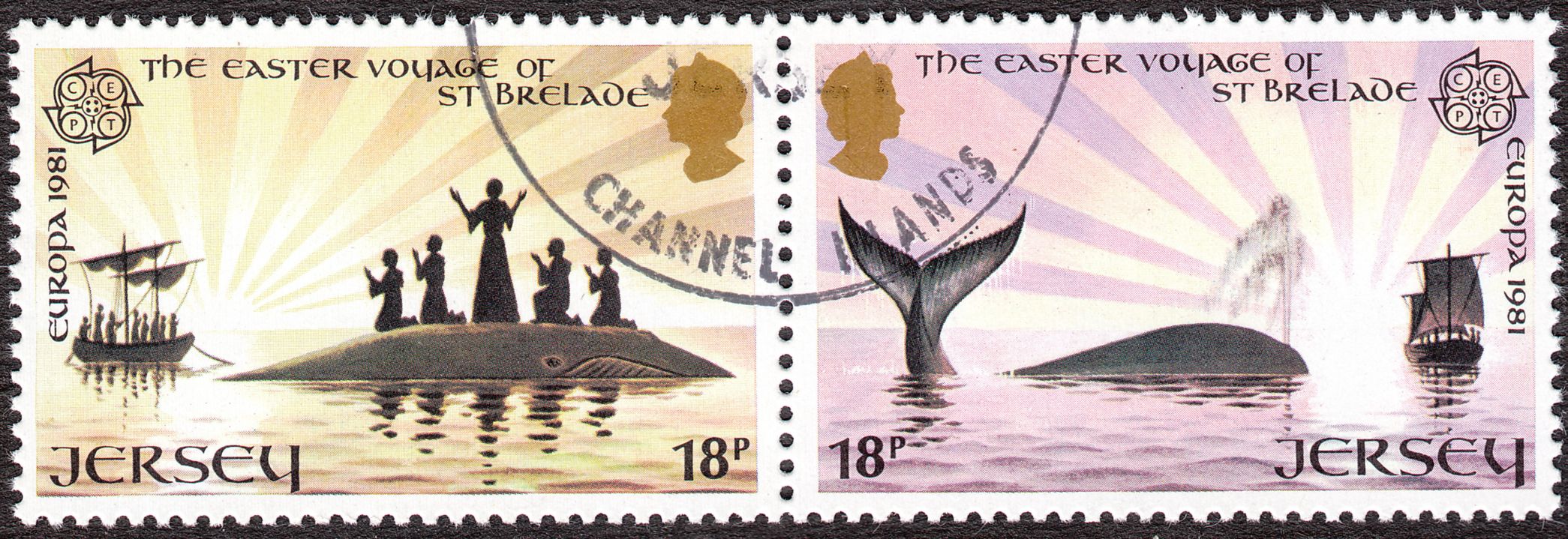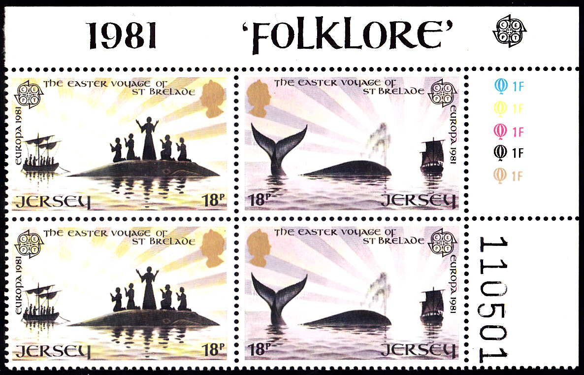 Auf der Insel Jersey erschienen die Europamarken 1981 zum Gemeinschaftsthema "Folklore" am 7. April 1981. Hier je zwei der beiden Marken zu 18 Pence vom rechten oberen Bogenrand mit Bogenzählnummer und der Plattennummer in den Druckfarben. Die beiden Marken sind als Zusammendruck erschienen und zeigen Abbildungen zu "Die Osterreise des hl. Brelade (Brendan)":