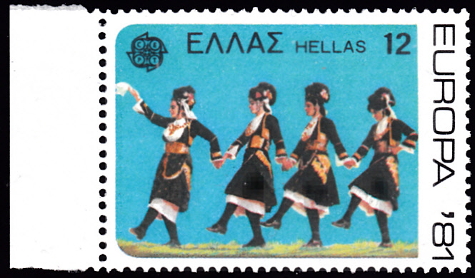 In Griechenland erschienen die Europamarken 1981 zum Gemeinschaftsthema "Folklore" am 4. Mai 1981. Hier ein Exemplar der Marke zu 12 Drachmen mit einer Abbildung zum Volkstanz "Kyra Maria". Die Auflage betrug 10 000 000 Stück.