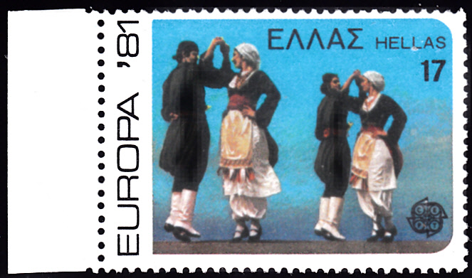 In Griechenland erschienen die Europamarken 1981 zum Gemeinschaftsthema "Folklore" am 4. Mai 1981. Hier ein Exemplar der Marke zu 17 Drachmen mit einer Abbildung zum Volkstanz Kretische "Sousta". Die Auflage betrug 1 039 394 Stück.