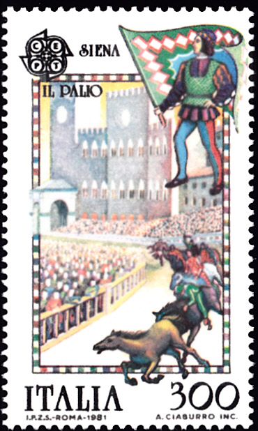 Die Europamarken 1981 zum Gemeinschaftsthema "Folklore" erschienen in Italien am 4. Mai 1981. Hier eine Marke zu 300 Lire mit der Abbildung eines Pferderennen in Siena. Die Auflage der Marke betrug 6 000 000 Stück.