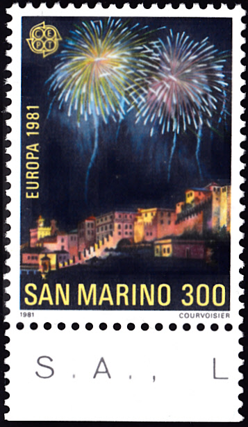 In San Marino erschienen die Europamarken 1981 zum Gemeinschaftsthema "Folklore" am 24. März 1981. Hier ein Exemplar der Marke zu 300 Lire mit einer Abbildung zum Feuerwerk am Nationalfeiertag (3. September). Die Auflage betrug 750 000 Stück.