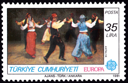 In der Türkei erschienen die Europamarken 1981 zum Gemeinschaftsthema "Folklore" am 4. Mai 1981. Hier die Marke zu 35 Lira mit einer Volkstanzgruppe aus Antalya. Die Auflage betrug 650 000 Stück.
