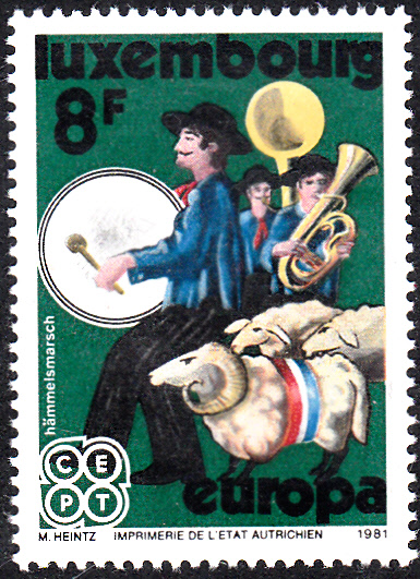 In Luxemburg erschienen die Europamarken 1981 zum Gemeinschaftsthema "Folklore" am 4. Mai 1981. Hier die Marke zu 8 Fr mit einem Motiv zum "Hämmelsmarsch", einem folkloristischer Umzug an Kirchweih. Die Auflage betrug 800 000 Stück.