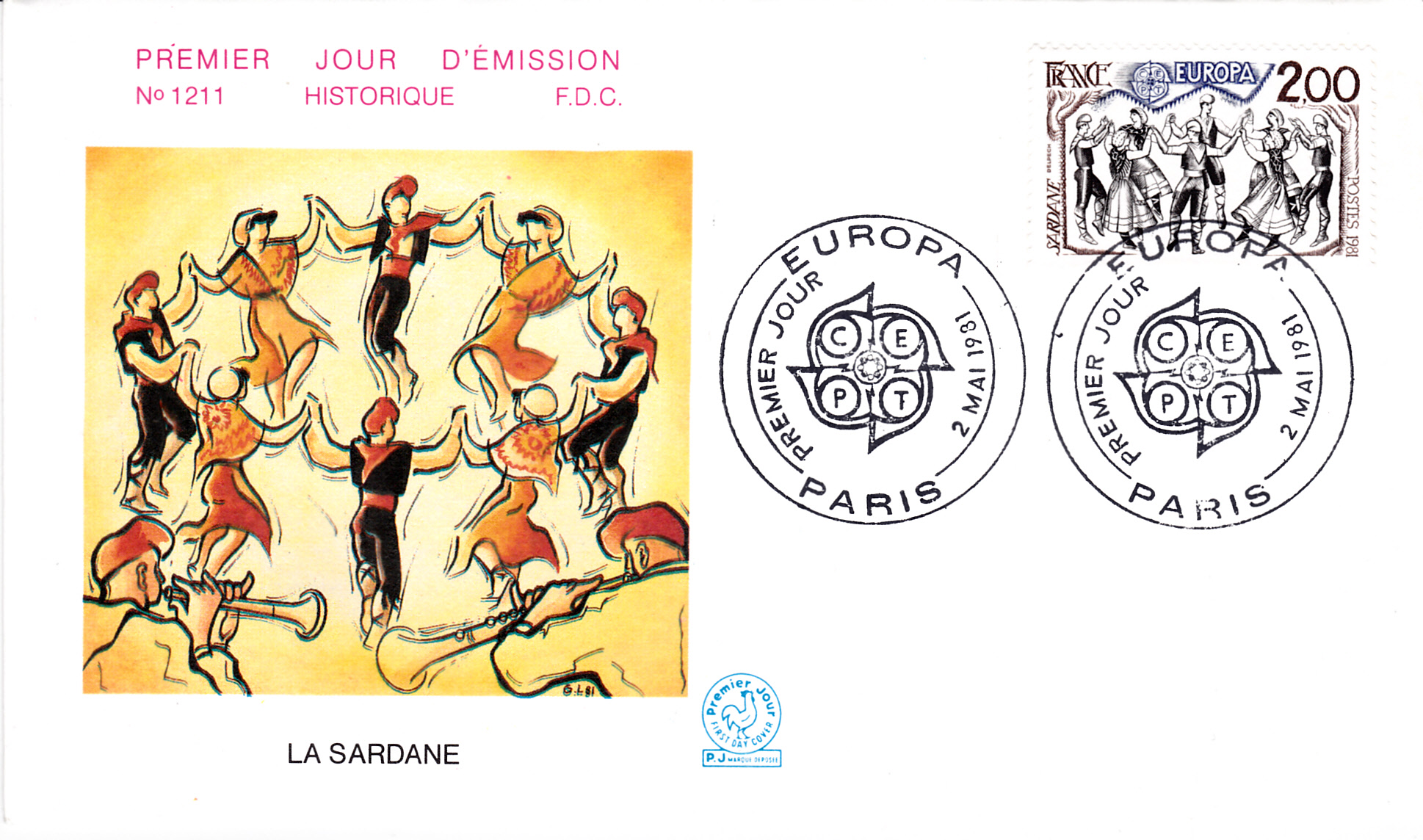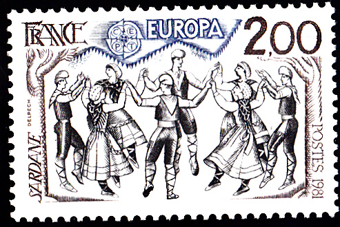 In Frankreich erschienen die Europamarken 1981 zum Gemeinschaftsthema "Folklore" am 2. Mai 1981. Hier die Marke zu 2,00 Fr mit einem Motiv zum "Sardane", einem Volkstanz aus dem Roussillon. Die Auflage betrug 10 000 000 Stück.