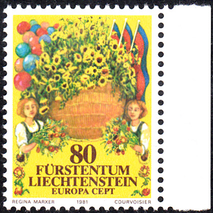 In Liechtenstein erschienen die Europamarken 1981 zum Gemeinschaftsthema "Folklore" am 9. März 1981. Hier die Marke zu 80 Rappen mit einem Motiv zum Festumzug am Staatsfeiertag (15. August). Die Auflage betrug 2 670 017 Stück.