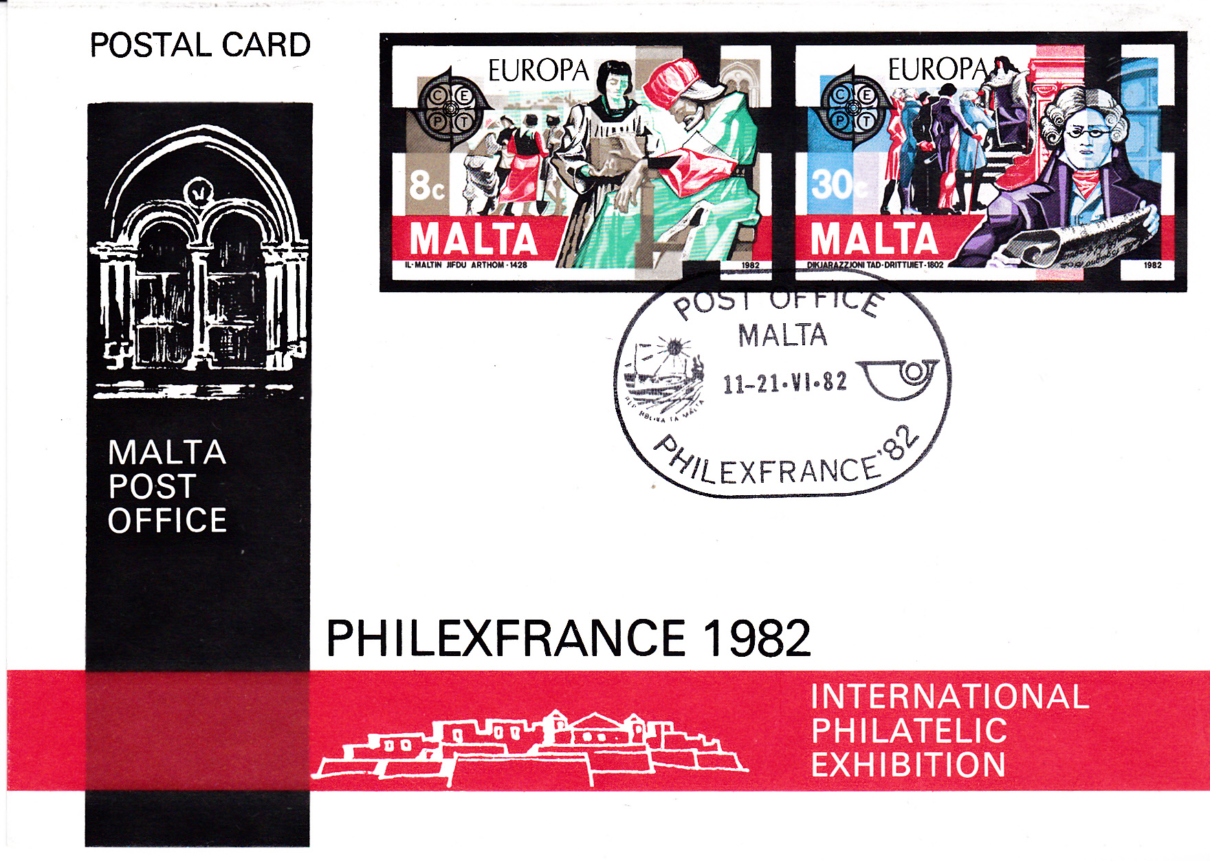 Die Ganzsache gibt es auch mit einem Sonderstempel, den die Post aus Malta an ihrem Stand bei der Philexfrance 1982 in Paris benutzte.