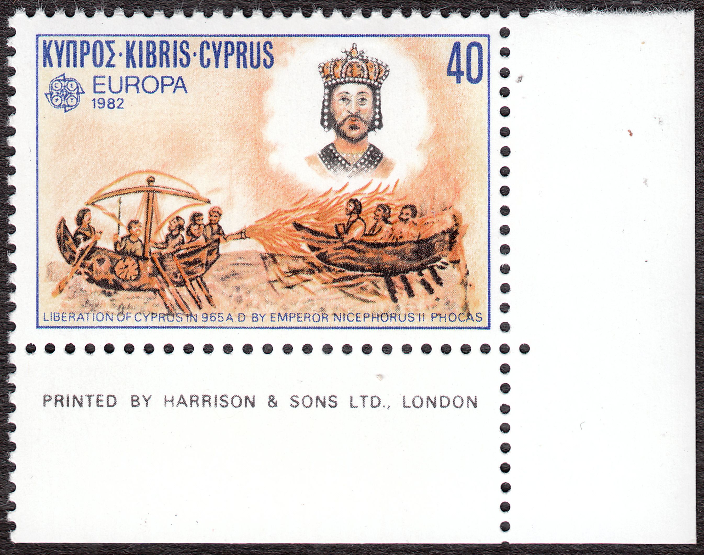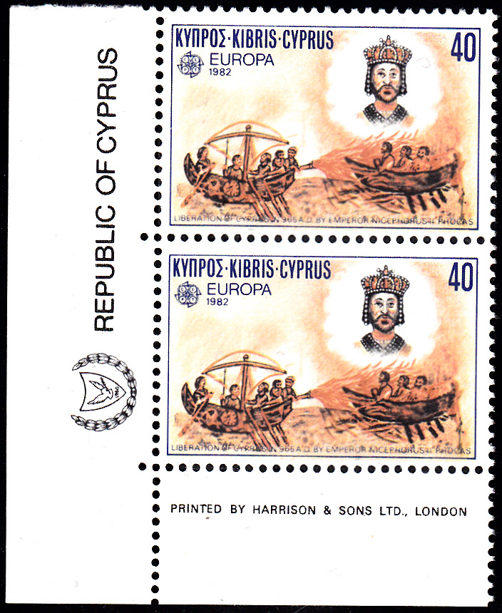 Auf Zypern erschienen die Europamarken 1982 zum Gemeinschaftsthema "Historische Ereignisse" am 3.Mai 1982 in einer Auflage von 1 500 000 Stück. Hier ein Paar der Marke zu 40 Mills vom linken unteren Eckrand mit einer Darstellung zum Thema "Befreiung Zyperns durch Kaiser Nikephoros II. Phokas (965)" mit Druckvermerk.