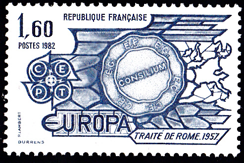 In Frankreich erschienen die Europamarken 1982 am 24. April 1982 zum Gemeinschaftsthema "Historische Ereignisse". Hier die Marke zu 1,60 Francs, die ein Siegel und eine Landkarte zur Erinnerung an die Unterzeichnung der Römischen Verträge im Jahre 1957 zeigt. Die Marke erschien in einer Auflage von 12 000 000 Stück.