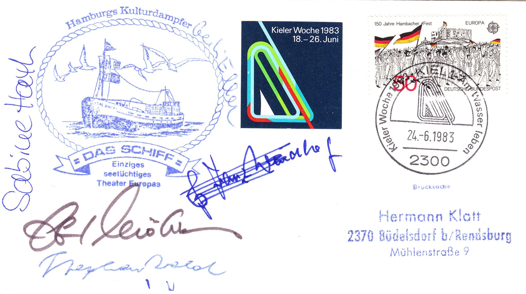 EF am 24.06.1983 portogerecht auf Drucksache als Gruß von der Kieler Woche, laut Cachetstempel von Bord des einzigen seetüchtigen Theaters Europas, Hamburgs Kulturdampfer "DAS SCHIFF", mit mehreren Autogrammen versehen: