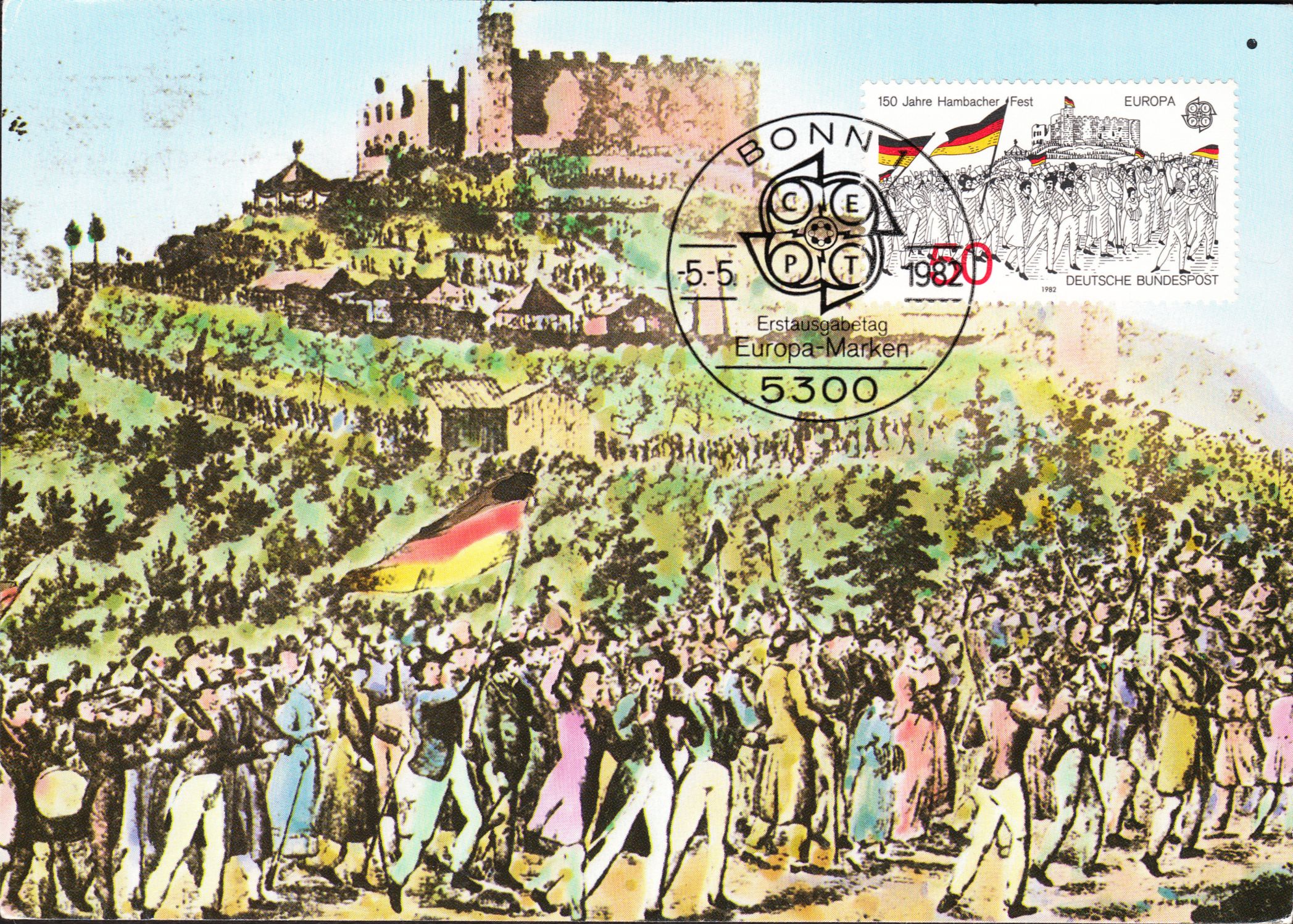 EF der Europamarke 1982 der Wertstufe zu 50 Pfennig am 17.05.1982 portogerecht auf Postkarte: