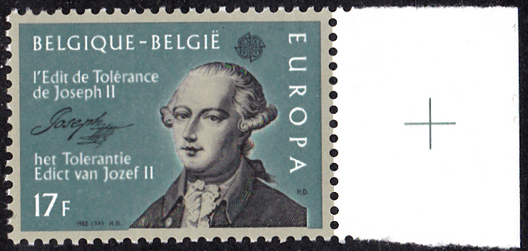 In Belgien erschienen die Europamarken 1982 zum Gemeinschaftsthema "Historische Ereignisse" am 1. Mai 1982. Hier ein Randstück mit Passerkreuz der Marke zu 17 Francs mit der Abbildung von Kaiser Joseph II. (1741-1790) in Erinnerung an das Toleranzedikt von 1781. Die Auflage betrug 3 000 000 Stück.
