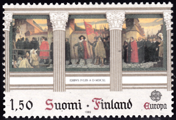 In Finnland erschienen die Europamarken 1982 zum Gemeinschaftsthema "Historische Ereignisse" am 29. April 1982. Hier die Marke zu 1,50 Mark mit einer Abbildung des Festzuges bei der Eröffnungsfeier der Akademie Turku (1640) nach einem Gemälde von Albert Edelfelt (1854-1905). Die Auflage betrug 4 000 000 Stück.