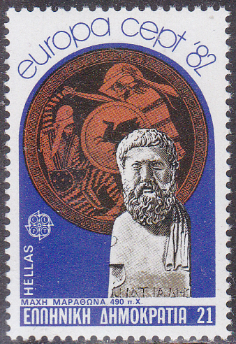 In Griechenland erschienen die Europamarken 1982 zum Gemeinschaftsthema "Historische Ereignisse" am 10. Mai 1982. Hier die Marke zu 21 Drachmen mit einer Darstellung zum Thema "Schlacht bei Marathon (490 v. Chr.)". Die Marke erschien in einer Auflage von 3 200 000 Stück.
