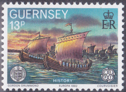 Auf der Insel Guernsey erschienen die Europamarken 1982 am 28. April 1982 zum Gemeinschaftsthema "Historische Ereignisse". Hier die Marke zu 13 Pence zur Schlacht von Hastings (1066) mit der Abbildung der Flotte von Herzog Wilhelm dem Eroberer. Die Marke erschien in einer Auflage von 2.820.311 Stück.