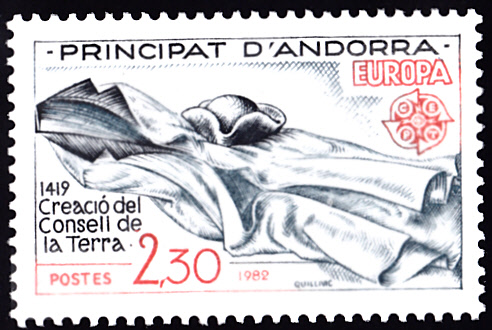 Bei der französischen Post in Andorra erschienen die Europamarken 1982 zum Gemeinschaftsthema "Historische Ereignisse" am 8.Mai 1982. Hier die Marke zu 2,30 Franc zur Bildung des Staatsrats (1419) mit einer Abbildung der Amtstracht. Die Marke erschien in einer Auflage von 800 000 Stück.