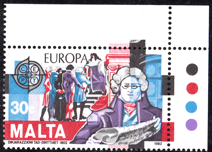In Malta erschienen die Europamarken 1982 zum Gemeinschaftsthema "Historische Ereignisse" am 29. April 1982. Hier eine Marke zu 30 Cent vom rechten oberen Eckrand mit einer Darstellung zum Thema " Rückgabe Maltas an den Johanniterorden durch Vertrag von Amiens (1802)".