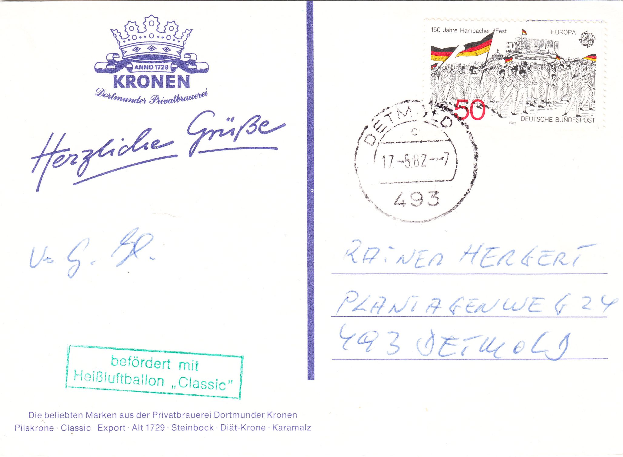 EF der Europamarke 1982 der Wertstufe zu 50 Pfennig am 17.05.1982 portogerecht auf Postkarte: