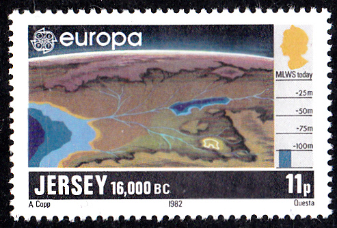 Auf Jersey erschienen die Europamarken 1982 zum Gemeinschaftsthema "Historische Ereignisse" am 20. April 1980 mit Darstellungen zum Thema "Erdgeschichtliche Entwicklung der Insel Jersey zwischen 16 000 bis 4000 v. Chr.". Hier eine der Marken zu 11 Pence mit der Darstellung aus dem Jahre 16 000 v.Chr.
