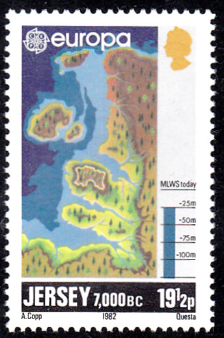 Auf Jersey erschienen die Europamarken 1982 zum Gemeinschaftsthema "Historische Ereignisse" am 20. April 1980 mit Darstellungen zum Thema "Erdgeschichtliche Entwicklung der Insel Jersey zwischen 16 000 bis 4000 v. Chr.". Hier eine der Marken zu 19 1/2 Pence mit der Darstellung aus dem Jahre 7 000 v.Chr.