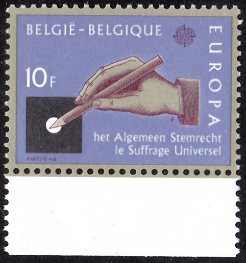 In Belgien erschienen die Europamarken 1982 zum Gemeinschaftsthema "Historische Ereignisse" am 1. Mai 1982. Hier die Marke zu 10 Francs mit der Abbildung "Hand kreuzt Stimmzettel an" in Erinnerung an die Einführung des allgemeinen Wahlrechts im Jahre 1921. Die Auflage betrug 10 000 000 Stück.