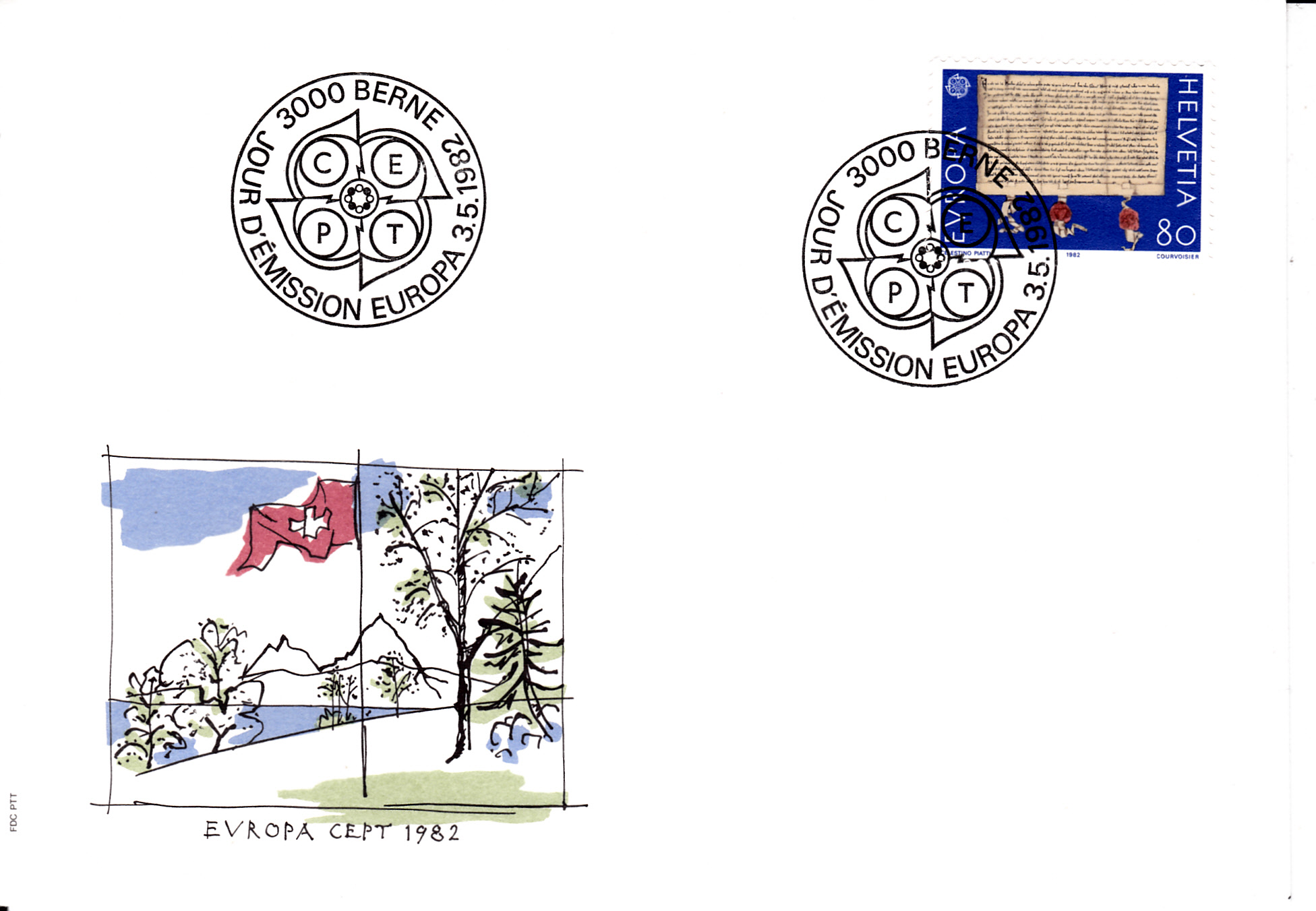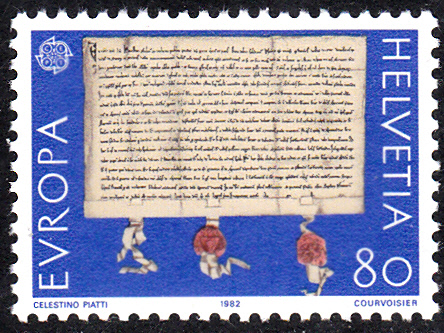 In der Schweiz erschienen die Europamarken 1982 zum Gemeinschaftsthema "Historische Ereignisse" am 3. Mai 1982. Hier die Marke zu 80 Rappen mit der Abbildung des Bundesbriefes (1291). Die Auflage der Marke betrug 9 527 000 Stück.