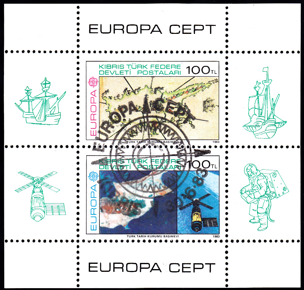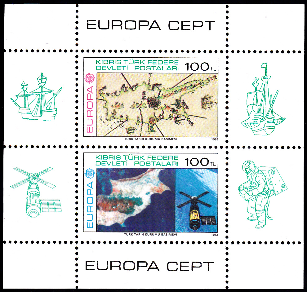 In Türkisch-Zypern erschienen die Europamarken 1983 als Block mit zwei Marken zu je 100 TL zum Gemeinschaftsthema "Große Werke des menschlichen Geistes" am 30. Juni 1983 in einer Auflage von 350 000 Blocks. Die beiden Marken zeigen auf einer Marke eine Landkarte Zyperns von Piri Reis (1470-1554), türkischer Geograph und eine Skylab-Aufnahme von Zypern auf der anderen Marke.