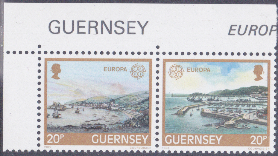Auf der Insel Guernsey erschienen die Europamarken 1983 am 14. März 1983 zum Gemeinschaftsthema "Große Werke des menschlichen Geistes". Hier die Marke zu 20 Pence mit einem Plan der Hafenanlage für 1987. Die Marke erschien in einer Auflage von 838.125 Stück.