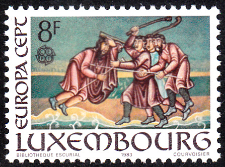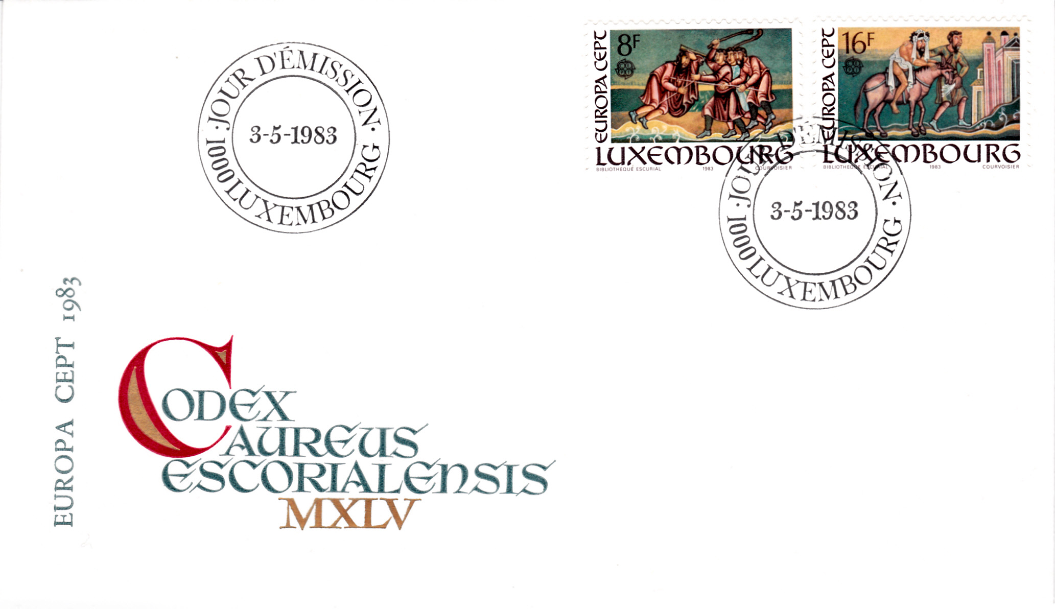 In der Luxemburg erschienen die Europamarken 1983 zum Gemeinschaftsthema "Große Werke des menschlichen Geistes" am 3.Mai 1983 mit Abbildungen von Miniaturen aus dem „Codex Aureus Escorialiensis“ (11. Jh.) zum Gleichnis vom barmherzigen Samariter. Hier die Marke zu 8 Fr.