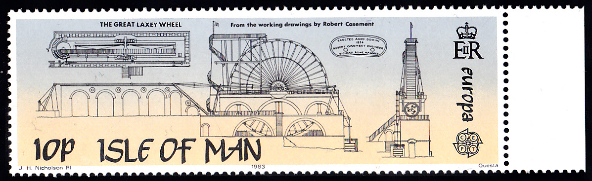 Auf der Insel Man erschienen die Europamarken 1983 am 18. Mai 1983 zum Gemeinschaftsthema "Große Werke des menschlichen Geistes". Hier die Marke zu 10 Pence, die die Konstruktionszeichnungen für das Wasserrad der Laxey-Erzmine zeigt. Die Marke erschien in einer Auflage von 653 743 Stück.