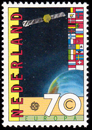 In den Niederlande erschienen die Europamarken 1983 am 17. Mai 1983 zum Gemeinschaftsthema "Große Werke des menschlichen Geistes". Hier die Marke zu 70 Cent, die den Europäischer Nachrichtensatellit ECS und die Flaggen der Mitgliedsländer von EUTELSAT zeigt. Die Marke erschien in einer Auflage von 14 454 600 Stück.