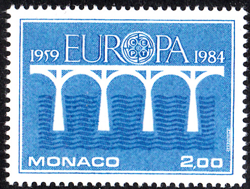 In Monaco erschienen die Europamarken 1984 anlässlich dem Jubiläum "25 Jahre Europäische Konferenz der Verwaltungen für das Post- und Fernmeldewesen (CEPT)" im einheitlichen Motiv "Brücke" am 10. Mai 1984. Hier die Marke zu 2,00 kobalt, die in einer Auflage von 317 486 Stück erschien.