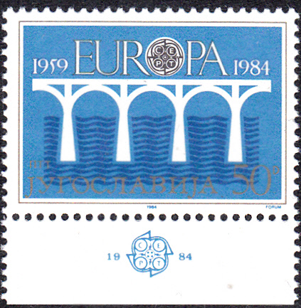In Jugoslawien erschienen die Europamarken 1984 anlässlich dem Jubiläum "25 Jahre Europäische Konferenz der Verwaltungen für das Post- und Fernmeldewesen (CEPT)" im einheitlichen Motiv "Brücke" am 30. April 1984. Hier die Marke zu 50 Dinar, die in einer Auflage von 700 000 Stück erschien.