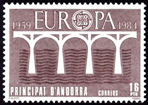 Bei der spanischen Post in Andorra erschienen die Europamarken 1984 anlässlich dem Jubiläum "25 Jahre Europäische Konferenz der Verwaltungen für das Post- und Fernmeldewesen (CEPT)" im einheitlichen Motiv "Brücke" am 5. Mai 1984. Hier die Marke zu 16 Pesetas, die in einer Auflage von 850 000 Stück erschien.