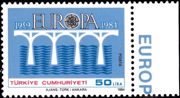In der Türkei erschienen die Europamarken 1984 anlässlich dem Jubiläum "25 Jahre Europäische Konferenz der Verwaltungen für das Post- und Fernmeldewesen (CEPT)" im einheitlichen Motiv "Brücke" am 30. April 1984. Hier die Marke zu 50 Lira, die in einer Auflage von 600 000 Stück erschien.
