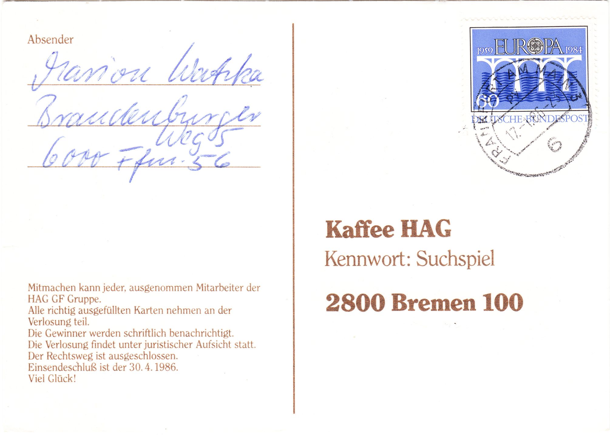 Hier noch eine EF der Europamarke 1984 der Wertstufe zu 60 Pfennig; diese wurde am 17.01.1986 portogerecht auf Postkarte verwendet: