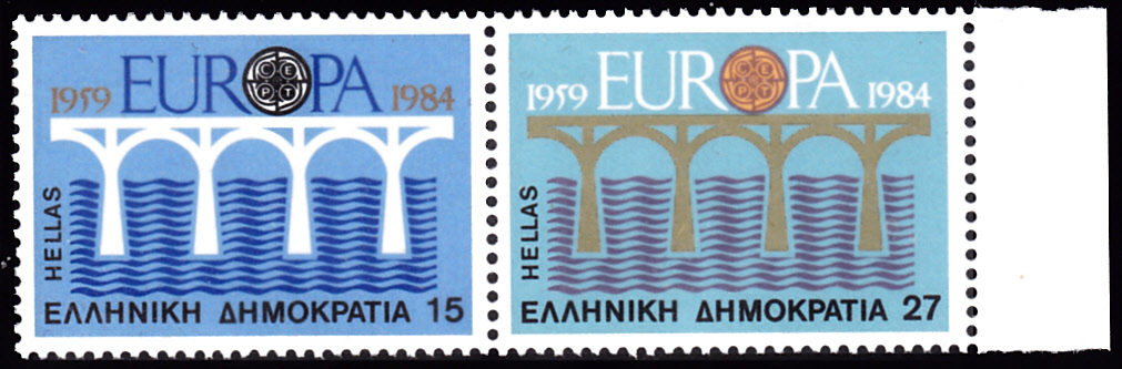 In Griechenland erschienen die Europamarken 1984 anlässlich dem Jubiläum "25 Jahre Europäische Konferenz der Verwaltungen für das Post- und Fernmeldewesen (CEPT)" im einheitlichen Motiv "Brücke" am 30 April 1984. Hier eine Marke zu 15 Drachmen, die in einer Auflage von 4 200 000, davon 500 000 im Zusammendruck-Bogen und 200 000 im Markenheftchen erschien.