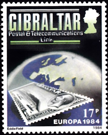 In Gibraltar erschienen die Europamarken 1984 anlässlich dem Jubiläum "25 Jahre Europäische Konferenz der Verwaltungen für das Post- und Fernmeldewesen (CEPT)" mit eigenen Motiven am 6. März 1984. Hier die Marke zu 17 Pence mit einer Abbildung der Marke Gibraltar MiNr. 98 vor einer Weltkugel.