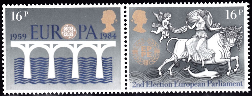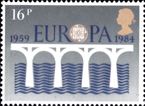 In Großbritannien erschienen die Europamarken 1984 anlässlich dem Jubiläum "25 Jahre Europäische Konferenz der Verwaltungen für das Post- und Fernmeldewesen (CEPT)" im einheitlichen Motiv "Brücke" am 15. Mai 1984. Hier die Marke zu 16 Pence, die in einer Auflage von 22 618 150 Stück erschien.
