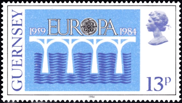 In Großbritannien-Guernsey erschienen die Europamarken 1984 anlässlich dem Jubiläum "25 Jahre Europäische Konferenz der Verwaltungen für das Post- und Fernmeldewesen (CEPT)" im einheitlichen Motiv "Brücke" am 10. April 1984. Hier die Marke zu 13 Pence, die in einer Auflage von 1 680 033 Stück erschien.