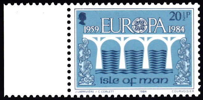 In Großbritannien-Isle of Man erschienen die Europamarken 1984 anlässlich dem Jubiläum "25 Jahre Europäische Konferenz der Verwaltungen für das Post- und Fernmeldewesen (CEPT)" im einheitlichen Motiv "Brücke" am 10. April 1984. Hier die Marke zu 20 1/2 Pence, die in einer Auflage von 715 479 Stück erschien.
