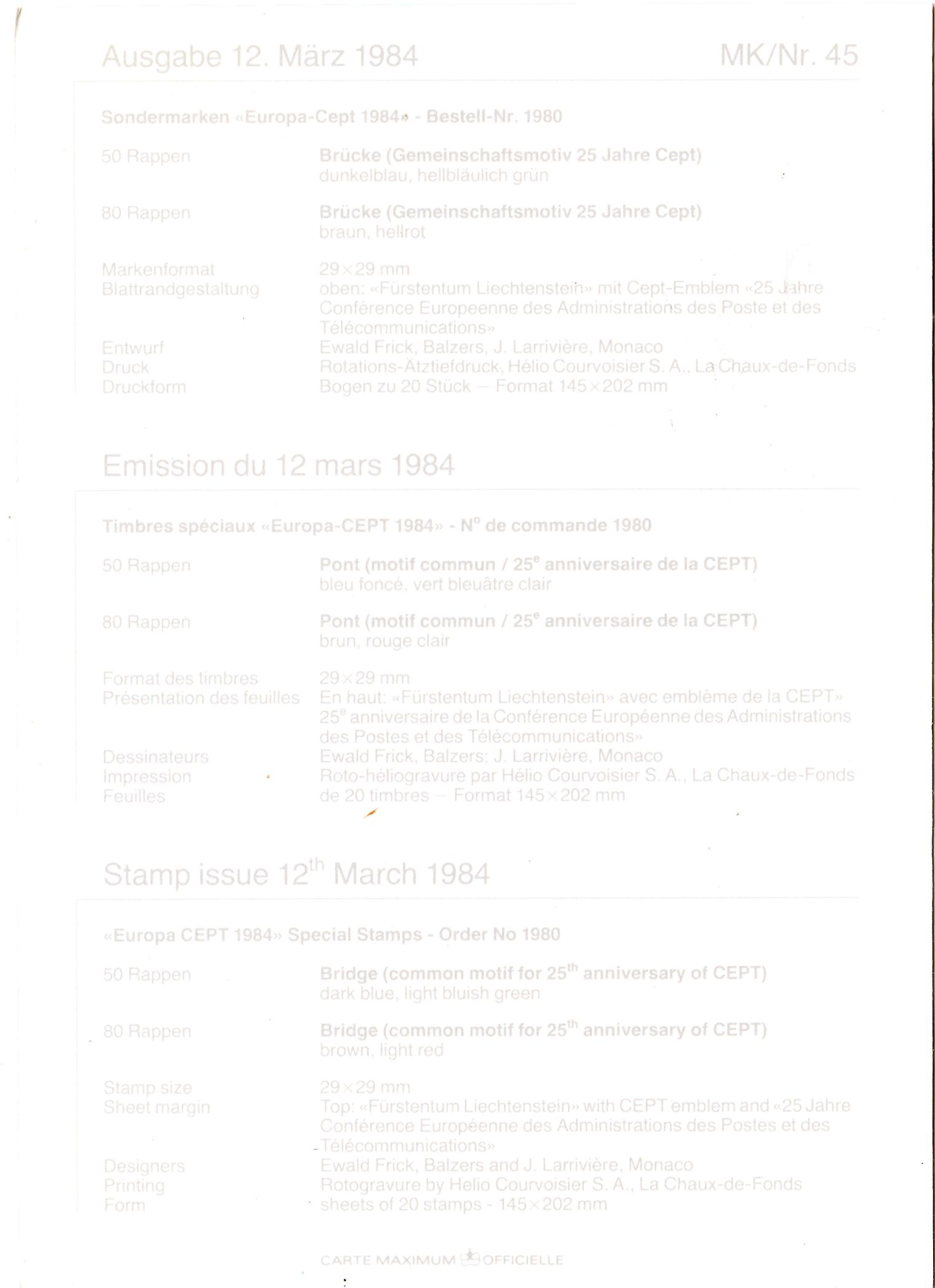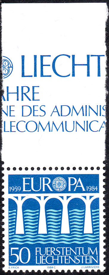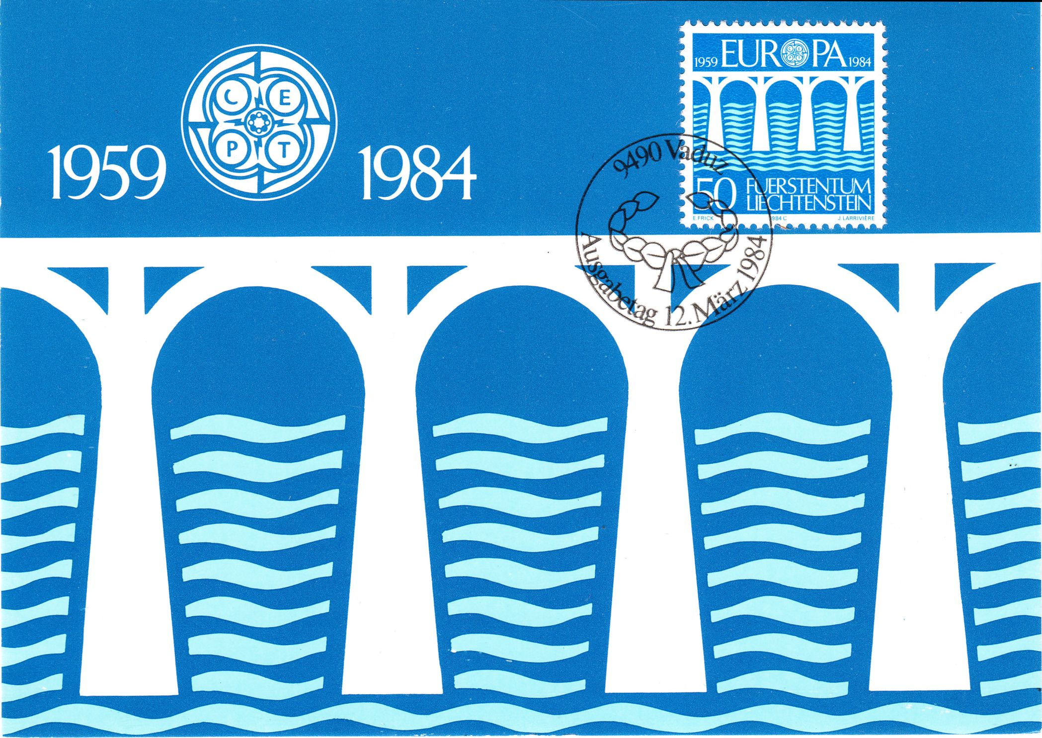 In Liechtenstein erschienen die Europamarken 1984 anlässlich dem Jubiläum "25 Jahre Europäische Konferenz der Verwaltungen für das Post- und Fernmeldewesen (CEPT)" im einheitlichen Motiv "Brücke" am 12. März 1984. Hier die Marke zu 50 Rappen ultramarin/hellpreußischblau, die in einer Auflage von 1 570 961 Stück erschien.