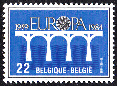 In Belgien erschienen die Europamarken 1984 anlässlich dem Jubiläum "25 Jahre Europäische Konferenz der Verwaltungen für das Post- und Fernmeldewesen (CEPT)" im einheitlichen Motiv "Brücke" am 5. Mai 1984. Hier die Marke zu 22 Francs, die in einer Auflage von 2 546 641 Stück erschien.