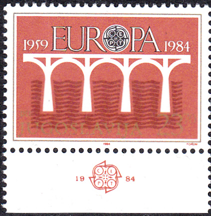In Jugoslawien erschienen die Europamarken 1984 anlässlich dem Jubiläum "25 Jahre Europäische Konferenz der Verwaltungen für das Post- und Fernmeldewesen (CEPT)" im einheitlichen Motiv "Brücke" am 30. April 1984. Hier die Marke zu 23,70 Dinar, die in einer Auflage von 700 000 Stück erschien.