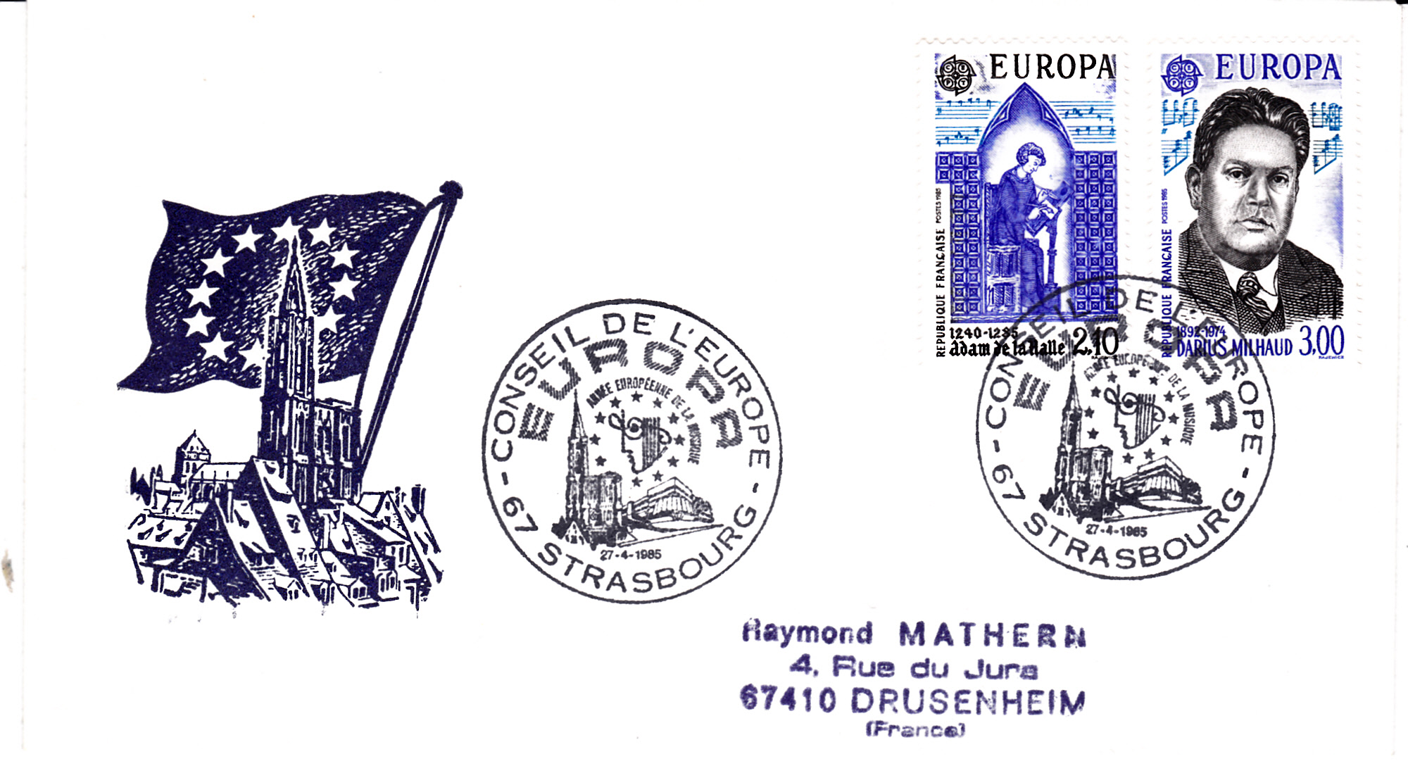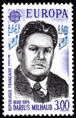 In Frankreich erschienen die Europamarken 1985 am 27. April zum Gemeinschaftsthema "Europäisches Jahr der Musik". Hier die Marke zu 3,00 Fr mit einem Porträt von Darius Milhaud (1892-1974, Komponist), die in einer Auflage von 6 000 000 Stück erschien.