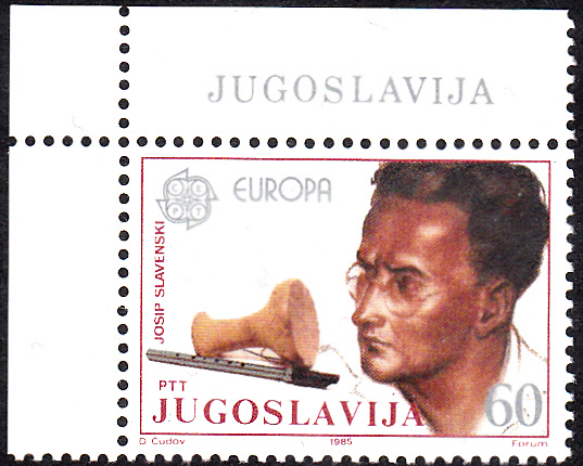 In Jugoslawien erschienen die Europamarken 1985 am 29. April 1985 zum Gemeinschaftsthema "Europäisches Jahr der Musik". Hier ein Eckrandstück der Marke zu 60 Dinar mit einem Porträt von Josip Štolcer-Slavenski (1896-1955, Komponist), einer Blockflöte und einer Darabukka, die in einer Auflage von 550 000 Stück erschien.